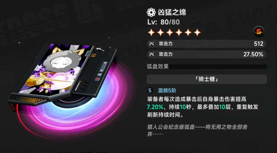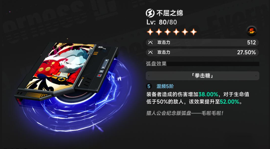 不屈之绵带有18%的攻击力并附一定的暴击率,其效果是给敌人增伤16%,当敌人血量在50%以下时,增伤效果翻倍。其适合离子主C的角色,比如娜娜莉和哈索尔,尤其适合BOSS战。凶猛之绵也是18%的伤害,附有暴击伤害,可叠加暴击伤害,最高能有10层,效果可观,高暴击的聚合系白藏非常适合该武器。极速之绵,可用于过度使用,攻击力增加22%,增加异常抗性的作用,当对手被控制时,可以叠加最高48%的攻击力伤害,适配液态主C的达芙蒂尔,当然后期有专武后,这个武器是可以被替代,所以并不保值。无畏之绵本能系使用,攻击伤害18%,附加暴击率。这个和不屈之绵相似,大招释放后能有10秒提升攻击时间,九原等比较适合,但是同样是有专武可以替代,性价比很低。最后是灵敏之绵,制约系使用,只有22%的攻击力提升,但是极限闪避后可最多叠加3层的增伤,该叠加效果非常难触发,而且覆盖率也很低。
