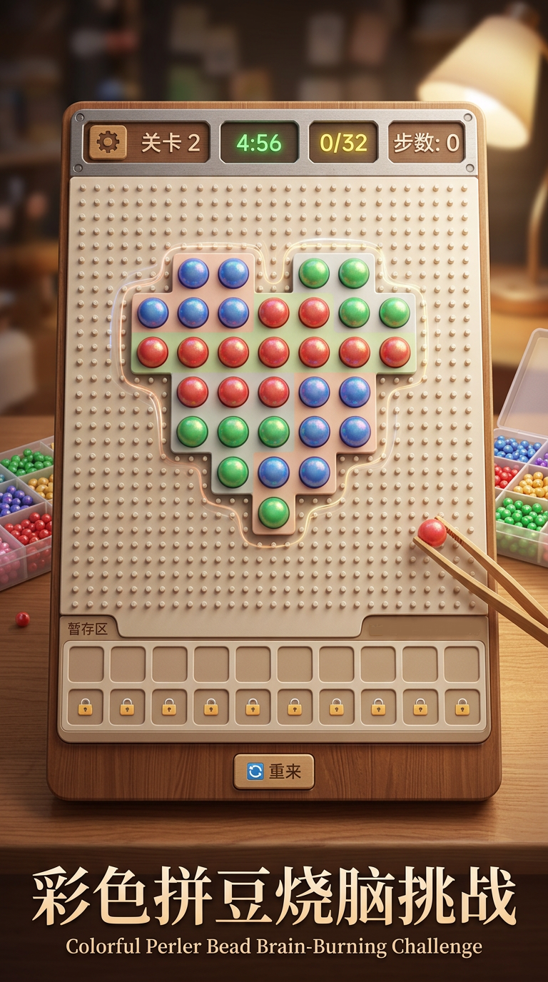 游戏采用经典像素美术风格,界面简洁、配色柔和,整体呈现轻量化、低负担的设计逻辑。玩法灵感源自实体拼豆手工,玩家通过点击并移动不同颜色的彩豆,按图索骥完成指定像素图案。每完成一次归位,均伴有清脆音效反馈,强化正向激励感。全程无需记忆复杂规则,零基础用户也能在30秒内理解操作逻辑,真正实现“打开即玩、随时暂停”。