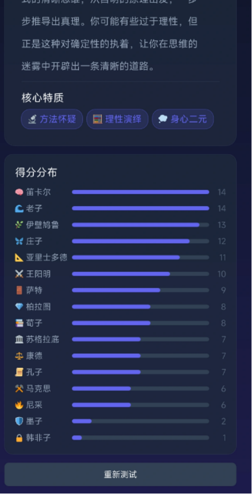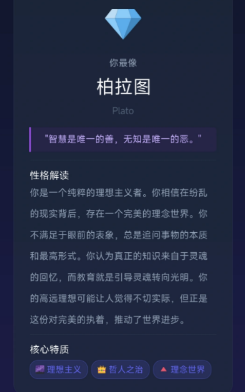 区别于传统答题类游戏,本作将哲学史知识自然嵌入题干逻辑中,每道题均对应特定流派的核心命题,如“性善性恶之辩”“自由意志是否存在”“幸福是否可被定义”等。玩家在作答过程中,不仅获得个性化哲学人格报告(含匹配度百分比、思想特征解读及延伸书单),还能解锁哲学家小传、经典语录与思想图谱,真正实现“玩中学、学中思”。游戏全程无战斗、无体力限制、无强制社交,操作极简,适配碎片化时间场景。