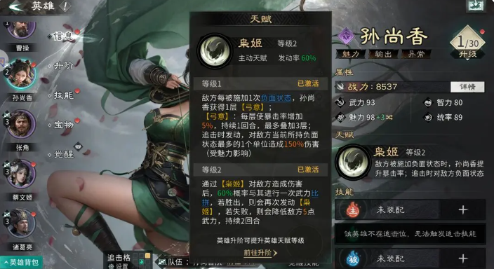 首位推荐的是魏国猛将张辽。其核心机制围绕“追击频次”与“兵力压制”展开:每回合最多可触发3次追击,且每次命中均提升基础伤害;当自身兵力高于目标时,单体攻击额外享受48%伤害加成。觉醒后技能可满格释放,配合天赋等级提升,还能激活协同增益效果,使其在机动输出体系中具备极强的节奏掌控力与爆发稳定性。