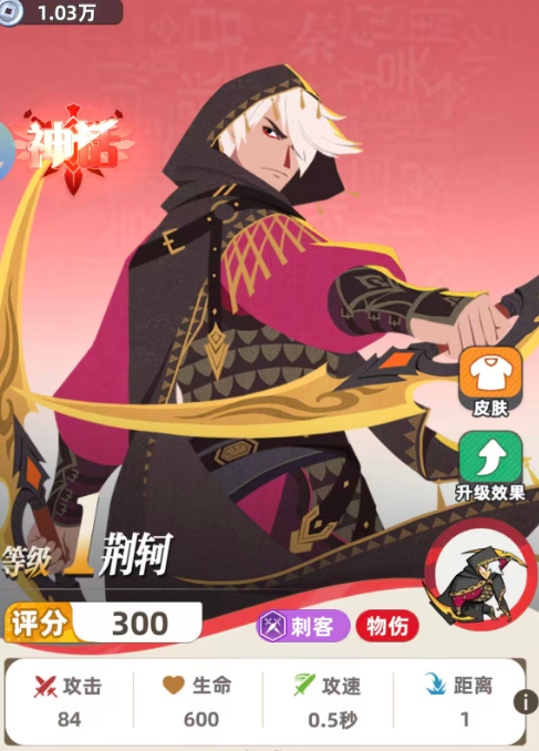 荆轲是刺客流派的核心收割者。基础普攻即造成50%额外伤害,暴击后可触发“刺客强化”:立即提升自身50%攻击力,满星时该加成提升至150%。此外,其升星机制具备概率性跃迁特性——每次升星均有7%几率直接连升两星,大幅缩短成型周期,契合快节奏刺客流速攻节奏。