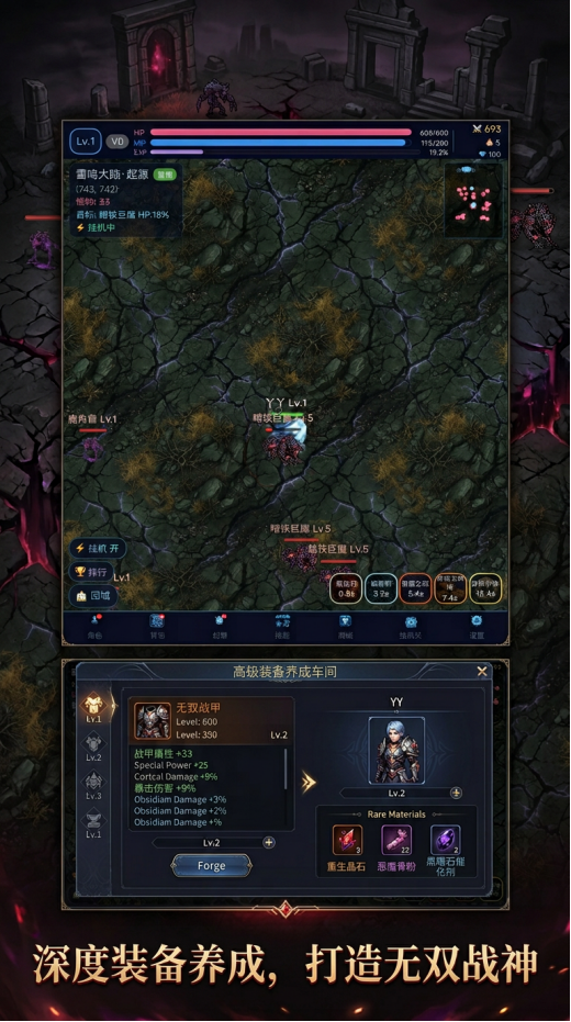 游戏构建十一大差异化魔域地图体系,涵盖恢弘主城、死寂沼泽、极寒荒原与幽邃地牢等多元场景。每张地图均埋设隐藏彩蛋与随机宝藏点,鼓励深度探索;日常任务按难度划分为简易、标准、挑战三档,新手可稳定获取经验与资源,老手亦能高效刷取进阶材料。全服战力排行榜实时同步更新,支持跨服比拼,冲击服务器巅峰排名,成就万人敬仰的暗黑主宰。