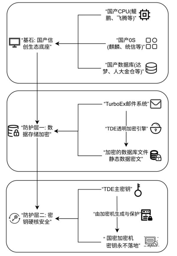 全栈自主可控,构建安全基座,某大型政府采用TurboEx全新一代信创版邮件系统,底层全面适配国产化硬件与基础软件。TurboEx系统部署于市信创政务云平台,实现从芯片、服务器、操作系统到上层应用的全栈自主可控,从根本上保障了政务通信的供应链安全。TurboEx 与卫士通国产SM4加密机进行了深度融合。系统在数据库引擎层启用了全库级别的 TDE透明数据加密,对包括邮件正文、附件、数据库及备份文件在内的所有静态数据,自动进行加密处理,且对用户和业务完全透明。同时,加解密过程全面采用 SM4国密算法,由卫士通国密加密机进行密钥的物理级保护,确保核心数据“存储即加密、介质不可读”,从根本上杜绝了物理介质泄露的风险。