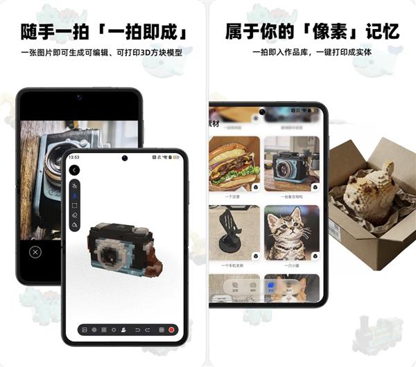 只需你拍照/导入图片,随你喜欢增加修饰后,AI就能施展“魔法”,同步生成2D像素画和高质量3D像素模型,无论是街景还是萌宠照,都能秒变像素艺术品,还能一键下单做成实体摆件。