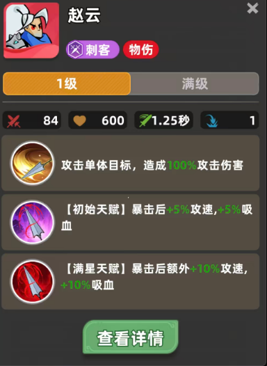 赵云的基础伤害为100%攻击力的单体物理攻击,虽无远程或范围效果,但其成长曲线明显偏向中后期——尤其在8级之后,攻速与吸血属性开始显著影响实战表现。当装备成型、星级提升后,他可通过高频普攻不断触发暴击,从而激活天赋带来的动态增益,实现越战越强的滚雪球效应。