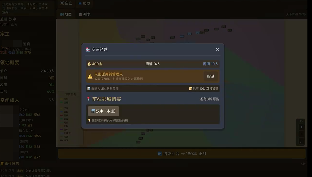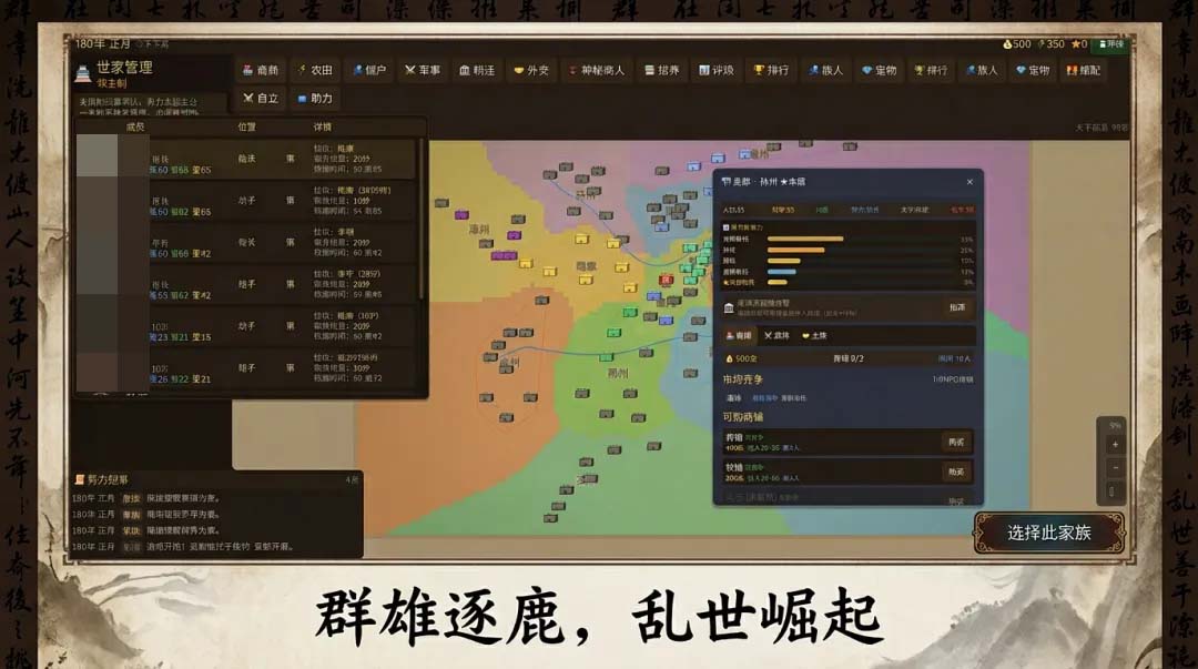 本作以东汉末年至三国鼎立时期为历史舞台,玩家将化身世家家主,统御宗族、调度资源、延揽人才,从一方乡豪起步,逐步构建可持续传承的百年望族。策略深度贯穿全局,每一步决策都将影响家族兴衰与时代走向。