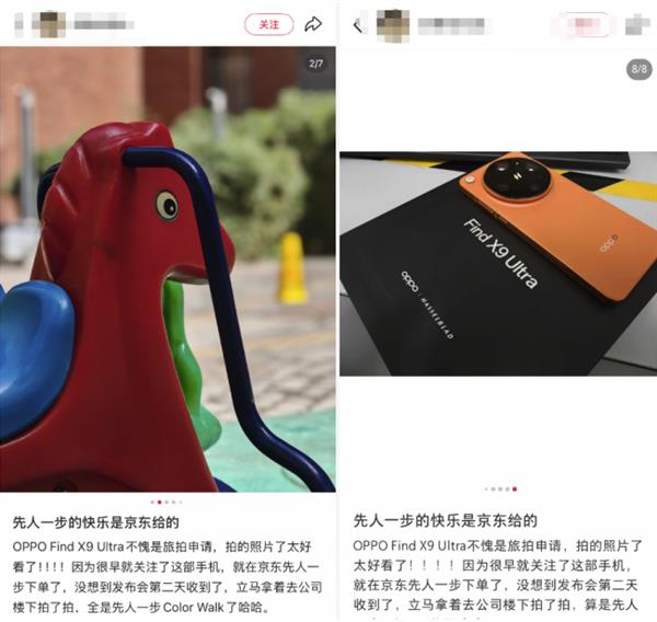 4月24日,OPPO Find X9s Pro、Find X9 Ultra正式开售,起售价5299元,京东同步首发。随着五一假期临近,不少用户早早将这两款影像旗舰列入旅行装备清单,希望能用新机记录假期精彩。依托京东与OPPO联合推出的“先人一步加速换新计划”,不少用户早在4月22日即发布会次日便已提前收到新机、完成开箱上手,并陆续在社交平台晒出使用新机拍摄的“ColorWalk”,真正做到先人一步下单、先人一步定格春日色彩。这些首批用户上手后纷纷给出好评,截至4月27日18:00,两款机型在京东平台用户好评率达99%。