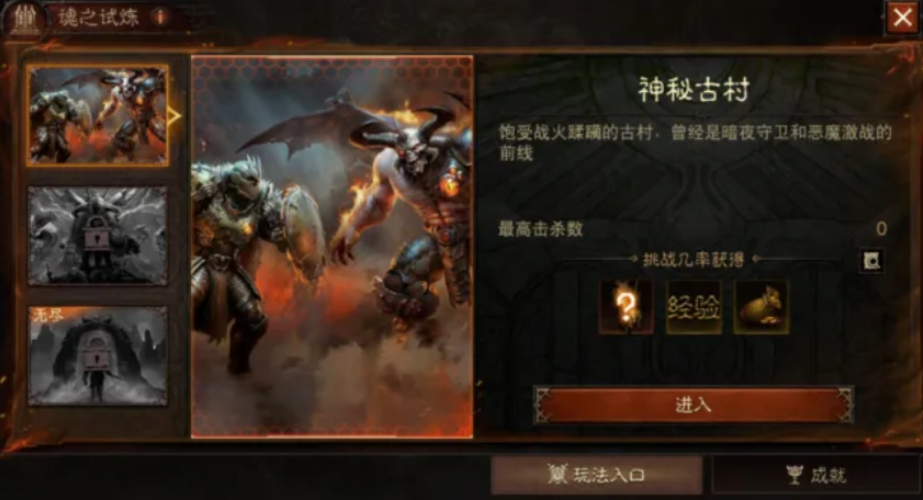 活动期间,玩家可前往凯恩小屋,通过原“魂之试炼”的入口直接进入“撕裂地狱”副本。该玩法采用Roguelike式动态构筑机制,全程分为三段式递进关卡:首关“神秘古村”为适应性战斗阶段,帮助玩家快速掌握连招节奏与技能协同逻辑;次关“深渊森林”敌方密度与单体强度显著提升,部分精英单位具备位移与控场能力;终关“遗忘平原”则迎来最高压强的连续波次进攻,需合理规划资源与走位空间。