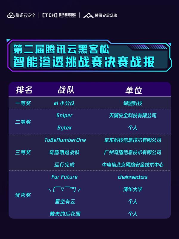 4月25日,第二届腾讯云黑客松智能渗透挑战赛决赛暨腾讯安全沙龙圆满落幕。来自企业、高校及个人开发者的十强战队,经过激烈的角逐,最终来自绿盟科技的“ai小分队”从国内外610支战队、1345名参赛选手中脱颖而出,夺得冠军。