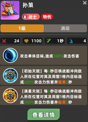 孙策——战士流派关键控制型主C。虽基础攻击仅为单体100%伤害,但其核心价值在于天赋机制:初始状态下,每8秒召唤一艘战船冲向敌方阵型,对目标及其周围1格内单位造成200%攻击力范围伤害,并附加2秒眩晕效果;满星后,战船释放频率提升至每5秒一次,大幅压缩敌方关键技能窗口期。尽管眩晕时长未随星级提升,但更高频的控制节奏,使其成为前排站位调整、集火时机创造与关键目标打断的理想人选,在强度维度上与马超并列为战士双核之一。