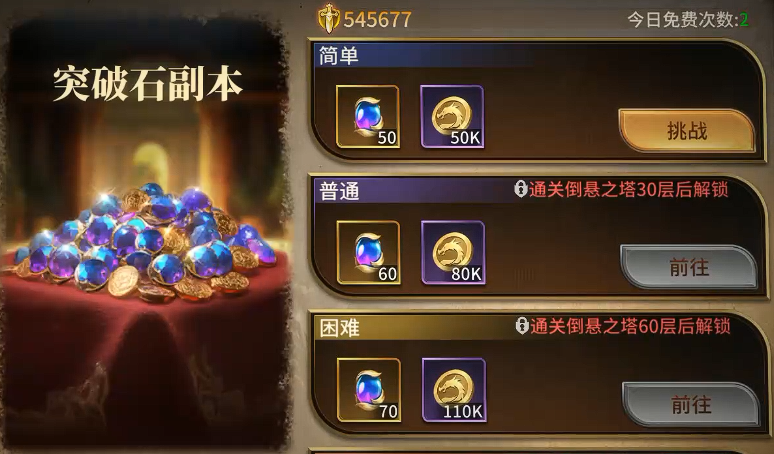 关于装备养成,新手阶段不建议过早投入资源合成低阶装备,因多数前期装备将在中期被高阶套装替代。更高效的策略是:根据当前缺口定向参与日常副本——金币副本、突破石副本等均设有明确产出目标,且每日提供固定免费挑战次数(例如突破石副本每日限免2次)。务必用尽所有免费额度;额外次数需消耗特殊入场券,该道具主要通过充值获取,故非必要不建议额外投入。通关后开启的扫荡功能,可大幅提升资源积累效率。待主线推进受阻、战力进入平台期时,再重点投入“悬赏系统”,该玩法按难度分级发布任务,玩家可根据自身战力灵活选择匹配度高的委托,实现精准补强。