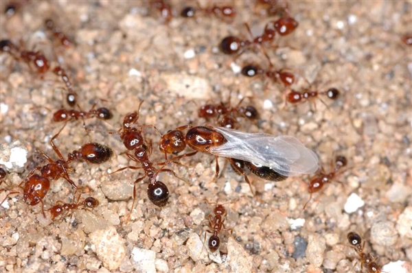 在那些生态环境保护得比较好的地方,通常没有红火蚁发生,本土蚂蚁会巡视自己的领地,消灭潜入的红火蚁繁殖蚁,但是一旦这些地方被挖掘或反复喷洒农药,造成本土蚂蚁的“力量真空”,就很可能会被红火蚁乘虚而入,形成新的种群。