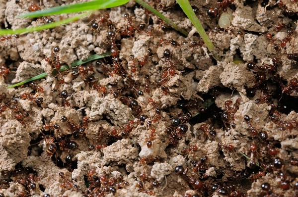 当然,这仍有可能造成误判,尤其是不要把它和那些工蚁同样有品级分化的本土蚂蚁们弄混,后者可是我们最可靠的盟友。其实,相比之下,成熟红火蚁的巢穴更容易辨认,那是一些隆出草地的小土包,内部呈蜂窝状结构,稍一惊扰,就有大批的蚂蚁蜂拥而出。