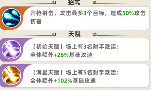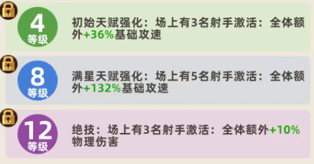 在羁绊协同方面,马可波罗与射手体系深度绑定。当场上存在3名射手时,其初始天赋即可触发全体射手26%的基础攻速加成,且该效果可与羁绊提供的攻速增益叠加生效,而非相互覆盖。随着星级提升,该机制持续强化:升至满星后,若场上达成5射手阵容,全体射手将额外获得102%攻速加成;进入4级阶段后,3射手触发的攻速增益进一步提升至36%;到达8级满星天赋阶段,则5射手可带来高达132%的全队攻速提升。这一数值远超常规射手所能达到的攻速上限,使马可波罗在单位时间内完成更多次攻击动作,从而放大其多目标输出优势。