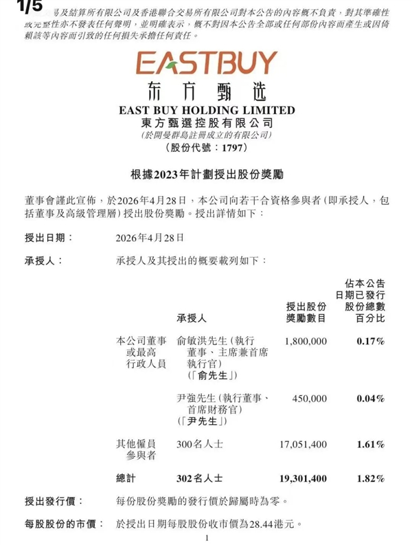 4月29日消息,4月28日晚间,东方甄选发布公告,根据公司2023年股份激励计划,向公司董事、高级管理人员及核心员工授出共计1930.14万股股份奖励,涉及302人,占公司已发行股份的1.82%。