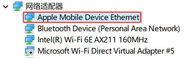 去电脑的“设备管理器”中找到“网络适配器”里查看,会出现一个新的“Apple Mobile Device Ethernet”网卡驱动。