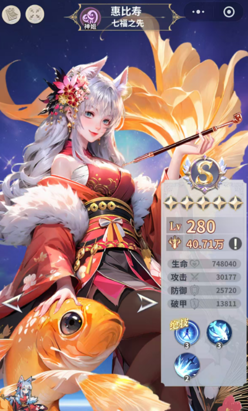 惠比寿作为神姬分支代表,机制围绕“数值博弈”设计。释放“海洋之力”后,进入与目标的生命值对比阶段:若敌方当前生命低于自身10%,触发吞噬控制,打断其行动序列;若敌方生命高于自身,则自身物理伤害提升至280%。该机制使其在单体压制与爆发输出间具备动态切换能力。此外,其被动提供10%伤害减免,在保证输出稳定性的同时增强持续作战韧性。
