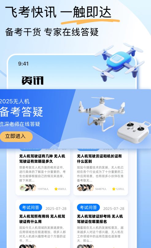 面向全阶段飞手的一站式信息服务平台。无论初学者查阅机型参数、对比主流品牌性能差异,还是资深用户追踪市场报价、了解最新行业动态,该应用均提供结构化数据支持。同步集成民航局最新执照考试题库与实操评分标准,配套图文解析与视频演示,助力用户高效备考、精准提分。