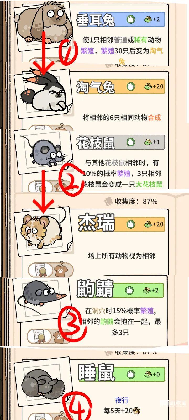 4、开始:如图开局拿①垂耳兔三十局后变为淘气兔,没变淘气兔前别拿③鼩鼱容易爆仓;④随时可拿,主拿②花枝鼠其他看具体情况拿,目标是合成杰瑞,合成杰瑞后可继续繁殖②花枝鼠。找主要装备,帐篷越多越好。