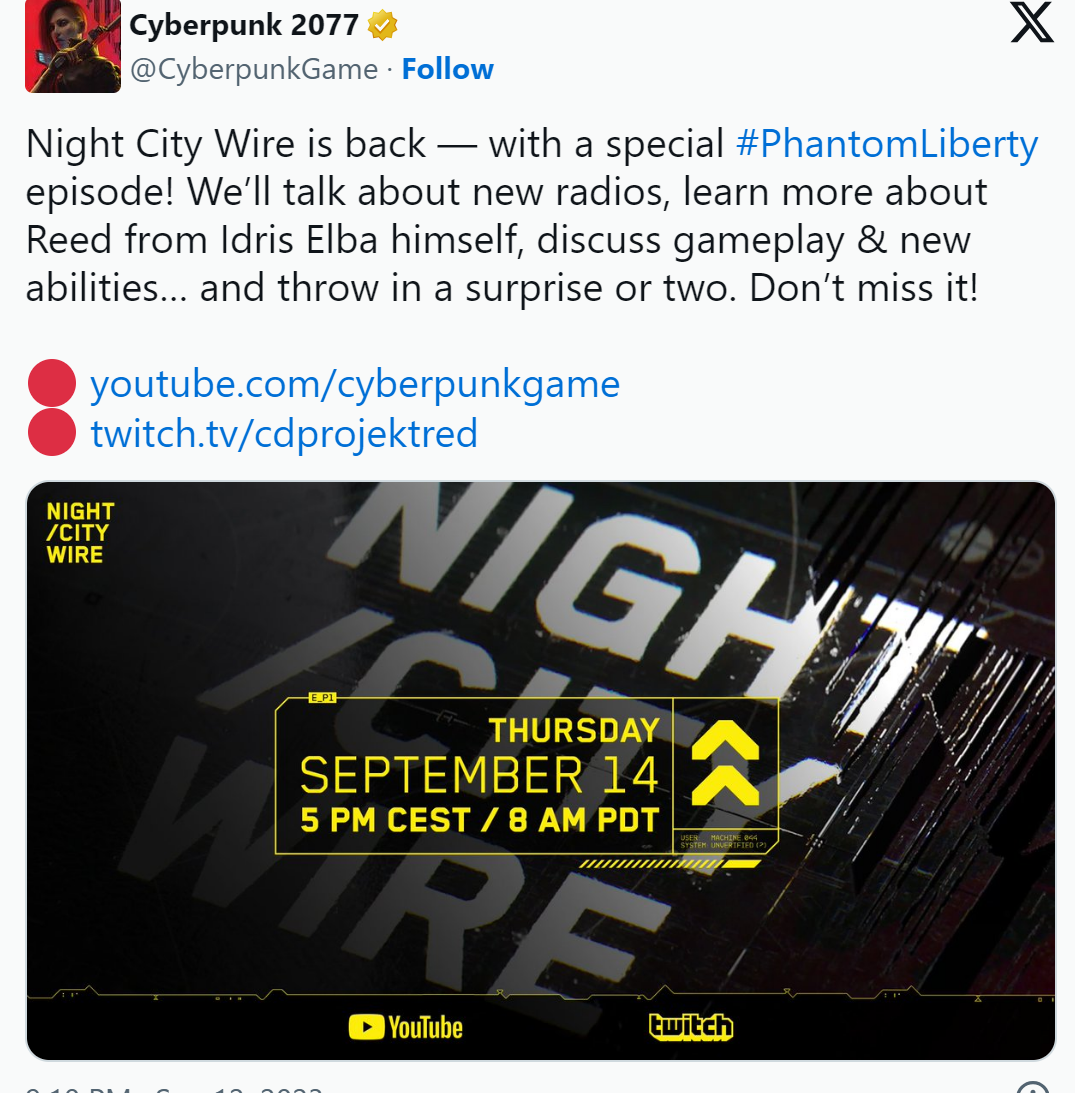 该开发商宣布,将于北京时间9月14日晚上23点公布新一期夜之城节目,介绍“往日之影”的细节以及游戏的一些拓展和游戏机制。CDPR还表示将透露一两个惊喜,此外,有关2.0版本也会公布,包括上线时间。