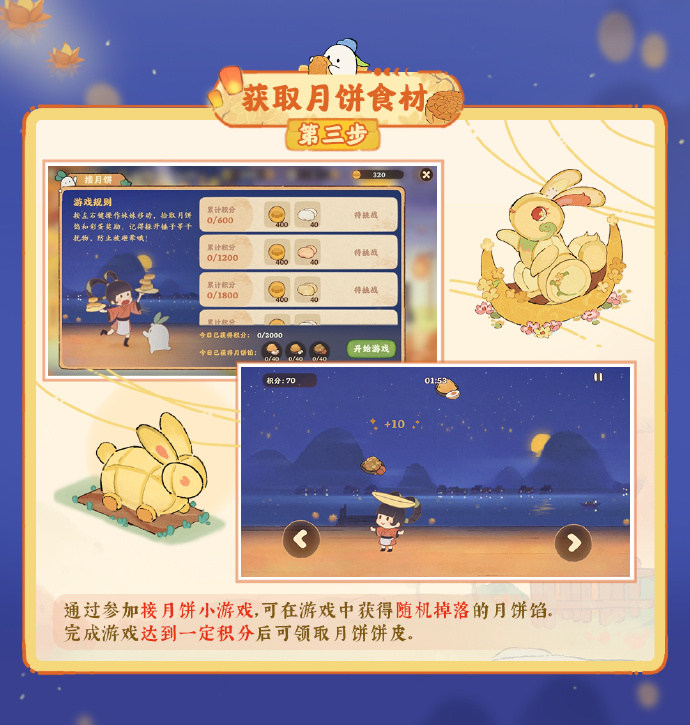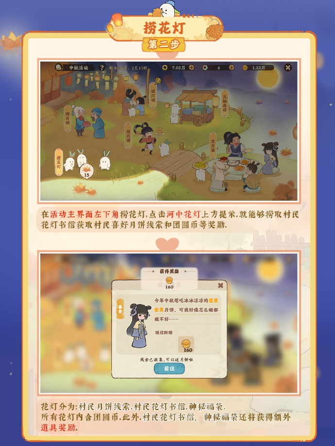 中秋佳节,扶光想邀请村民上山吃团圆饭,山民们快来帮助扶光筹备赏月宴吧!同时限定的趣味节日小游戏「猜灯谜」也将会在活动期间开放。