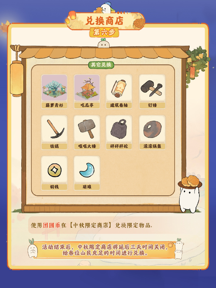 小萝卜温馨提示:活动结束后,中秋限定商店将延后三天时间关闭,给各位山民充足的时间进行兑换萝!
