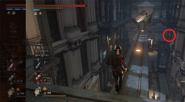 1、首先来到博览会展厅,来到这里的房梁上干掉举盾哥,然后再跳到图中所示的台子上去找贝儿领任务。