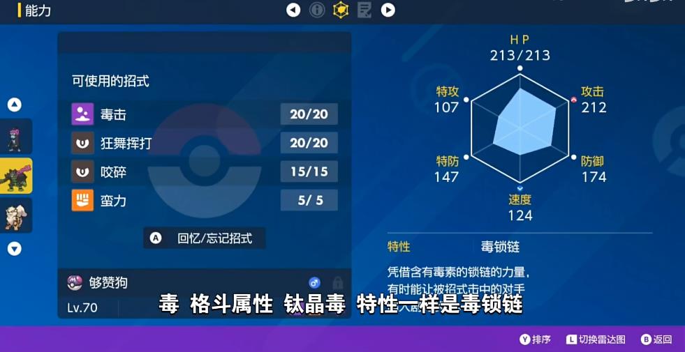 3、够赞狗是格斗、毒属性,钛晶毒,特性一样是毒锁链,是一只非常强大的宝可梦,非常建议玩家捕捉。