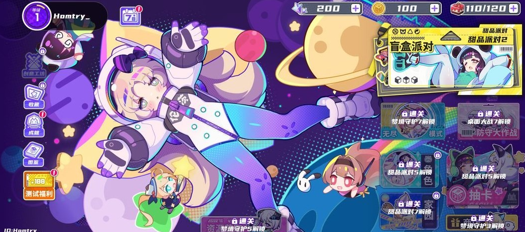 甜品5通关后抽奖就解锁了。记得把测试福利(主界面左下角)和签到(主界面左上角)领取掉,然后你的资源应该跟我差不多。如图3所示。