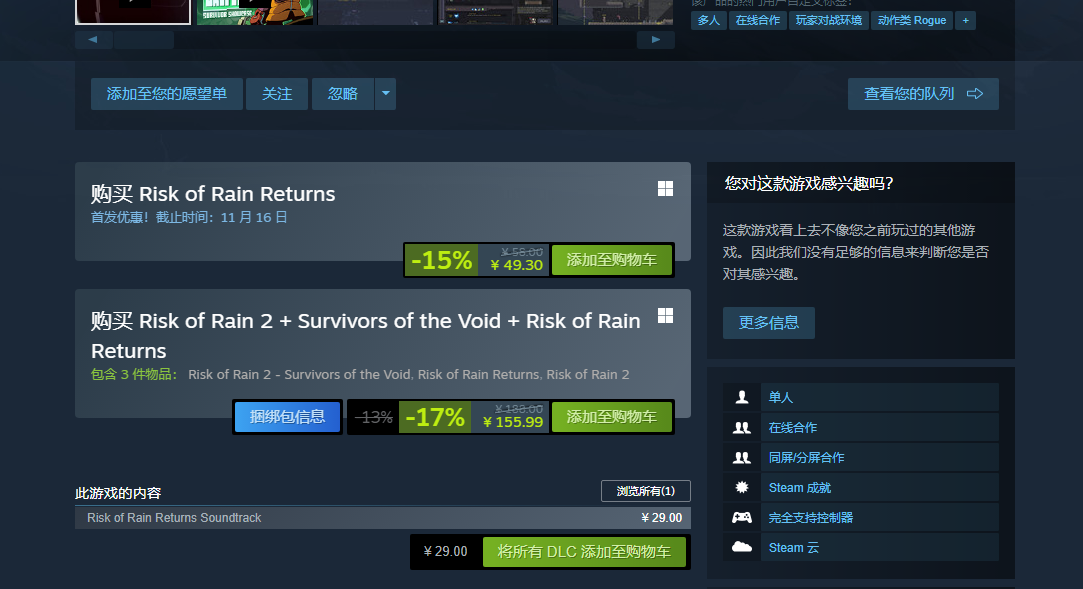 《雨中冒险:回归》国区原价58元,目前处于首发优惠中,仅需49.3元即可入库,首发优惠截止11 月 16 日。