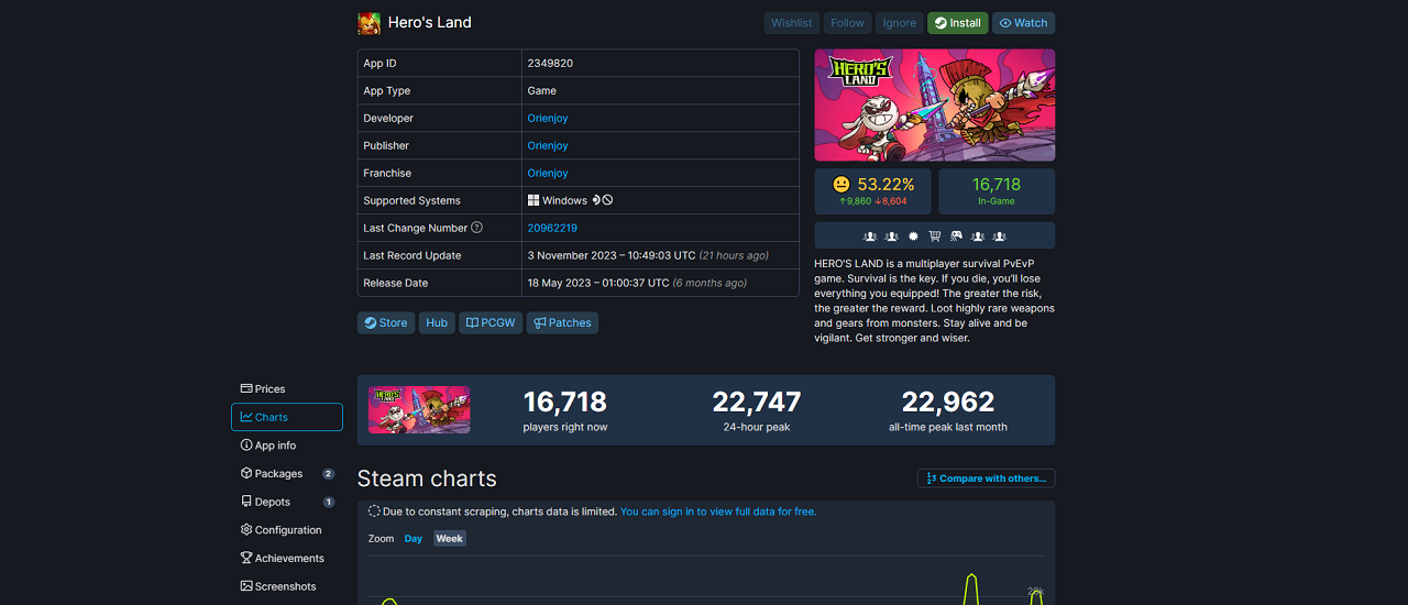 目前来看,新上线的限时【探险生存】吃鸡玩法确实对保持游戏高在线高活跃有着不错的效果。通过SteamDB榜单可以看到,该游戏每日同时在线峰值都稳定在2万以上,这在国产游戏里也是比较优异的成绩了。