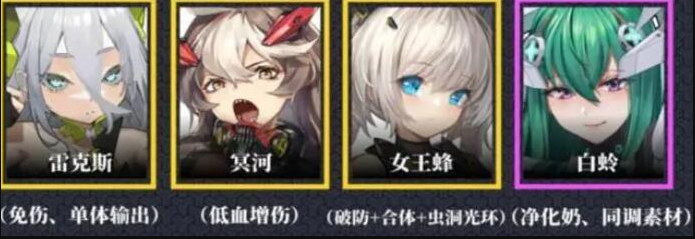 1、T0级别的角色有雷克斯(单体输出)、宾河(低血增伤)、女王蜂(破防合体光环)、白蛉(净化奶)