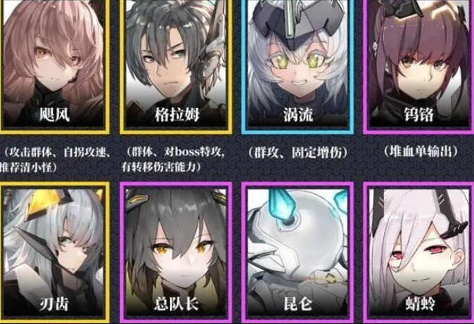 2、T0.5级别的角色有飓风(群攻)、格拉姆(群攻 伤害转移)、涡流(群攻增伤)、钨铬(单体输出)等角色。
