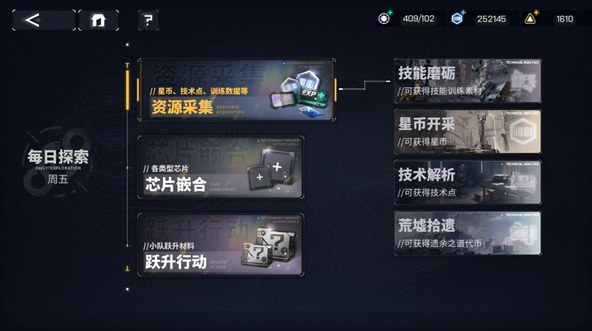 2、资源采集能领到各类养成资源与通用货币,芯片嵌合能获得相同套装下的随机部件芯片,跃升行动可获得不同阵营的特定养成材料。