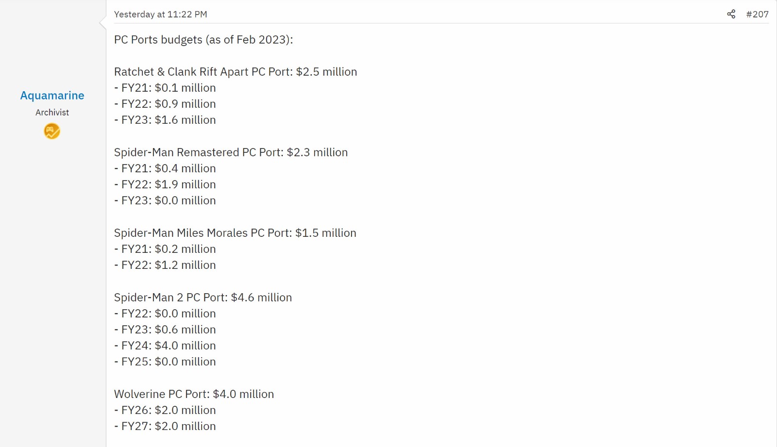 Install Base论坛用户Aquamarine发布消息称,在针对Insomniac的勒索软件攻击后泄露到网上的一份机密文件中,详细列出了该工作室已发售游戏和未来游戏PC移植版本的预算。