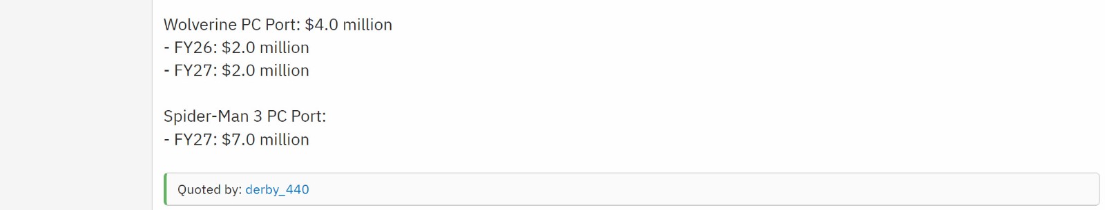 虽然即将面世的《漫威蜘蛛侠2》PC移植版会成为Insomniac最昂贵的移植作品,但预计2027财年推出的《漫威蜘蛛侠3》PC移植版将以700万美元的成本超越它。