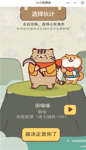 小小桃源岛小程序是一款微信的休闲益智的游戏,小小桃源岛小程序的画风整体是卡通的,游戏在最开始的时候玩家要选择不同的小动物在岛屿上不断的生活和经营下去。各种有趣的冒险体验选择,丰富的挑战可以尝试,在里面可以得到可爱的宠物,模拟真实的岛屿生活,和你的朋友在小岛中享受快乐的生活时光,并在简单的操作模拟过程中享受更多的乐趣,各种场景都非常精美,每种风格的建筑都可以解锁,沉浸在自己的童话世界里,努力的打造自己的理想的小岛。