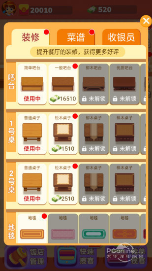 1、餐厅的玩法模式是非常丰富的,通过好的经营方式可以制作出更多的美味食物,还可以装饰成各种的样子;