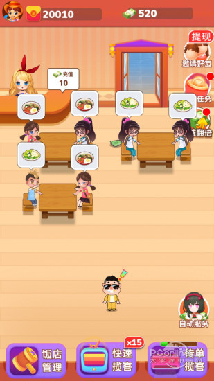 1、餐厅经营: 挂机收益,装饰自己的特色餐厅;