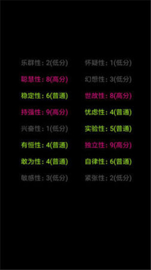 3、三是,这只是个小测试,并不能完全代表自己。游戏介绍中的截图,就是我本人的测试结果,我也有不少缺点,比如强势和不乐群,但是我现在觉得我生活得很幸福,也过得很好,所以有缺点并不可怕。但是,一定不能对自己不满,因为这样可能会形成恶性循环,你需要做的是——首先认清自己,然后接受不完美的自己——来自一位奔三大叔的忠告。