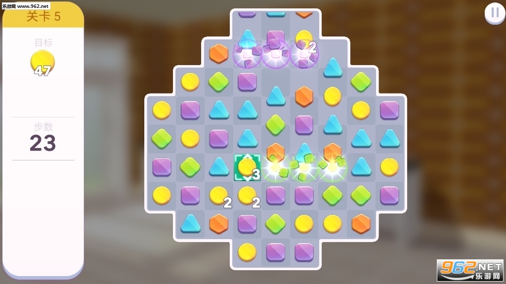 红、黄、橙、蓝、绿五种颜色的几何基础图案和各种道具、障碍等搭配而成的三消地图显得很简单整洁,特效也比较低调,让人看起来很顺眼;