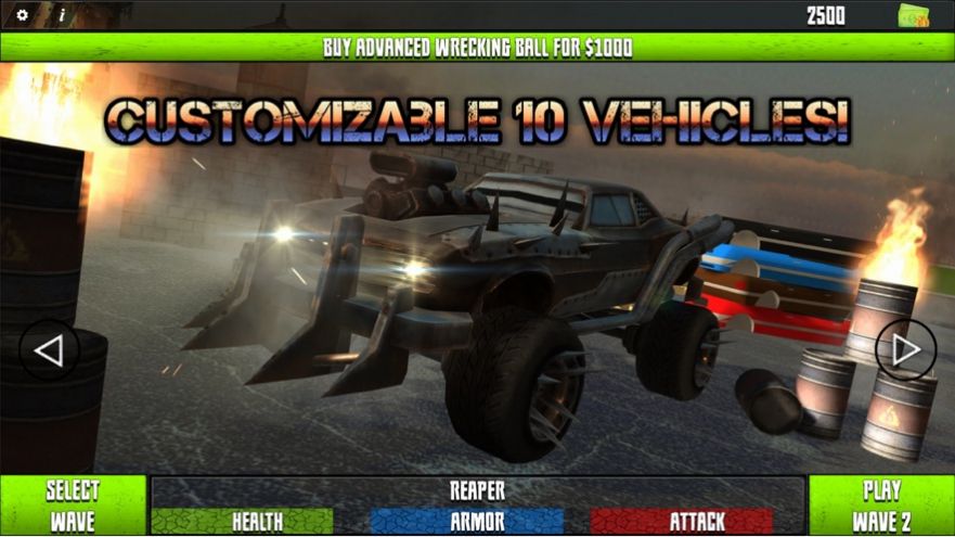 1、面对众多的僵尸,你需要利用自己的战车来干掉它们才行;