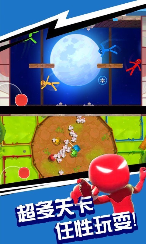 游戏者一个人要面对三个火柴人的挑战。这里有十几种不同的趣味玩法,
