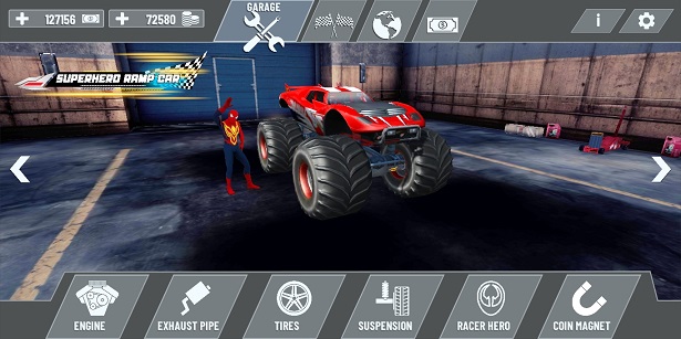 1、车库里有不同跳跃的不同超级英雄,你可以和每个超级英雄一起玩。