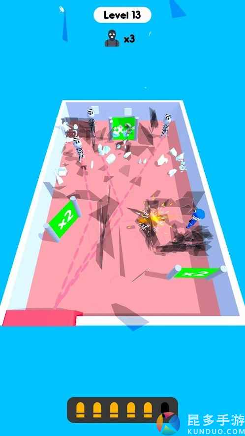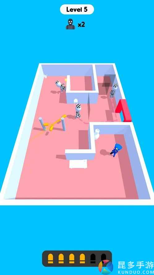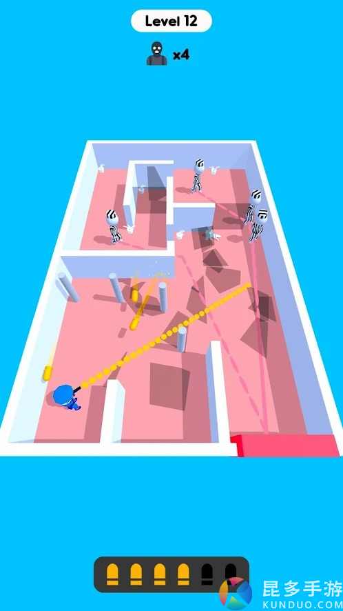 游戏开始后,你需要滑动屏幕,让警察瞄准射击,不过瞄准线并不能直接瞄准犯人的,会通过墙壁反射到犯人的身上,以此击中犯人。