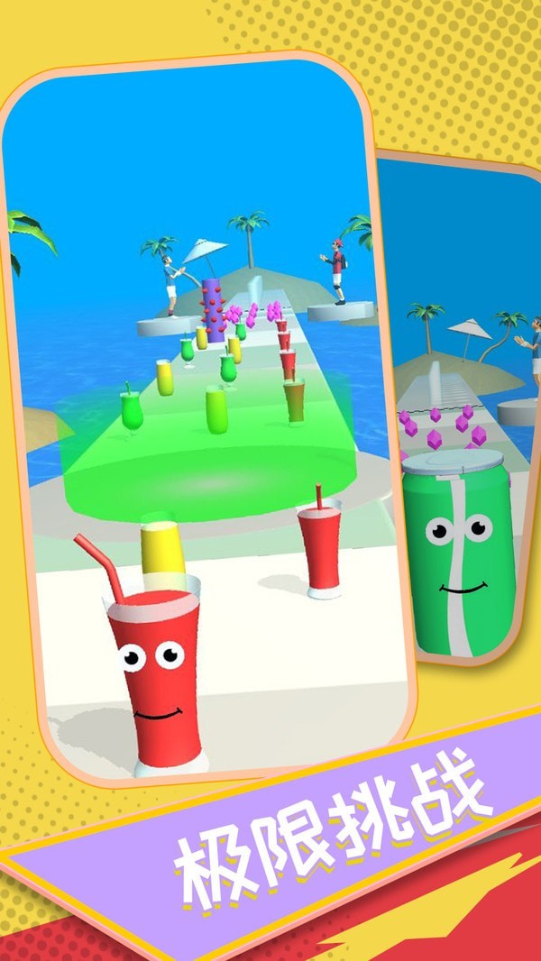 一款简单有趣的跑酷游戏,在游戏中,玩家可以控制自己喜欢的饮料来闯关,一路上玩家可以拾取与自己相同的饮料,让饮料越来越大,当到达终点,就可以得到更多的钻石和解锁更多的新奇饮料。
