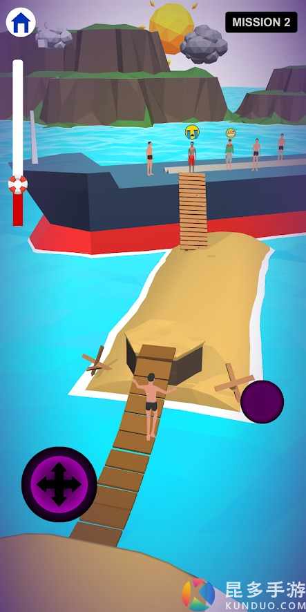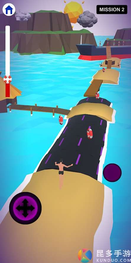 游戏开始后,你会看到有海浪扑过来,你需要滑动方向键让人物快速前进,点击跳跃键让人物跳跃。