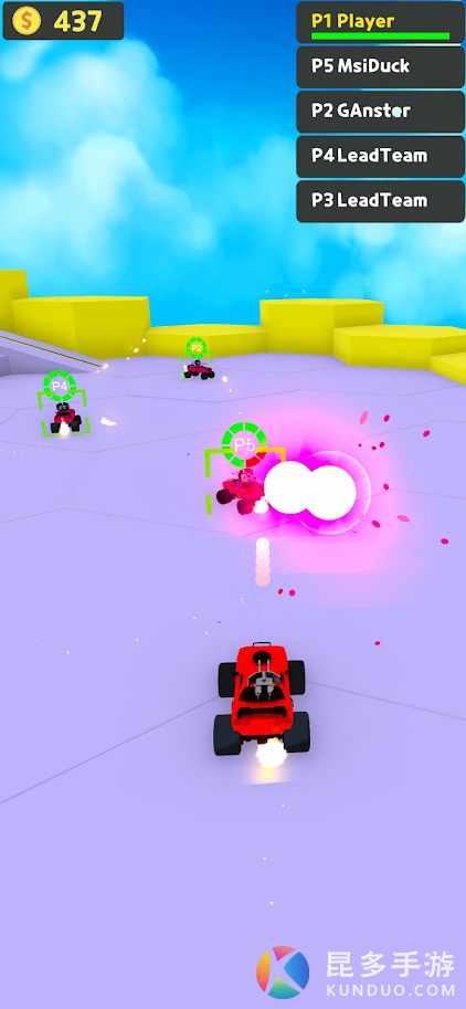 点击开始游戏,一般只能选择默认的汽车和武器,进入赛场,左右滑动屏幕,躲避对手的进攻并找机会干掉对手获得胜利,赢取奖金,解锁新战场继续战斗。