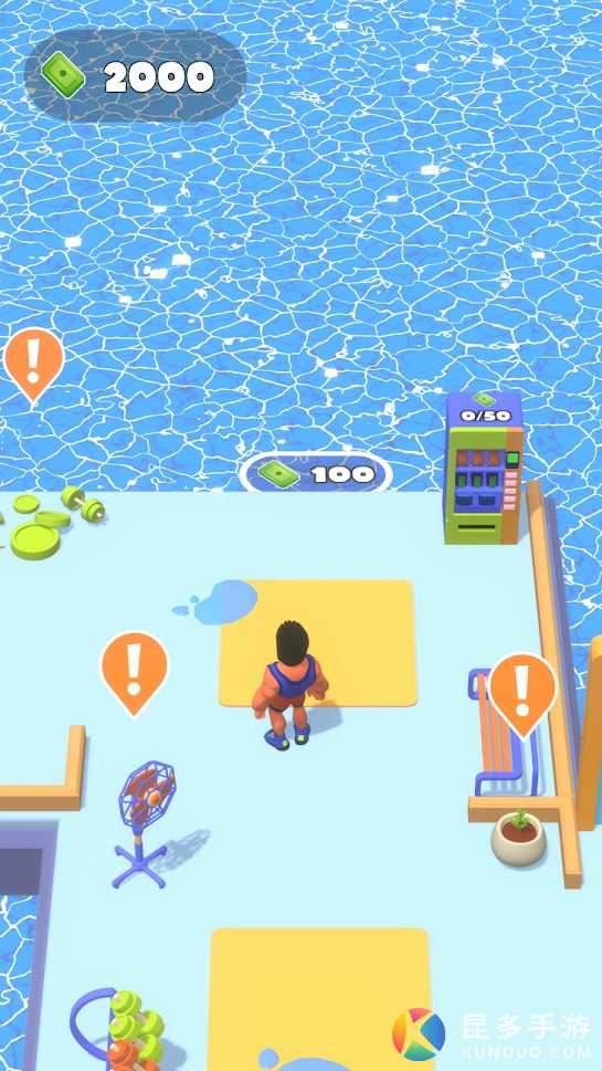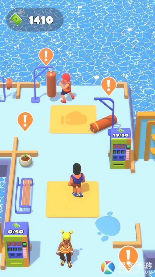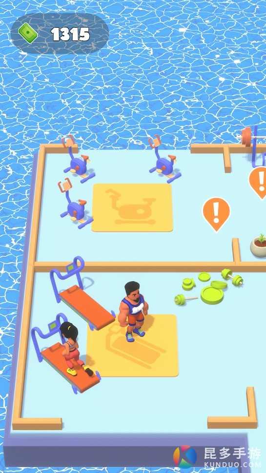 进入游戏后,通过任意滑动屏幕控制角色移动,走到带有“!”和设备旁边就会自动维护,完成后获得奖金。拥有足够的奖金后就可以解锁新的健身房。