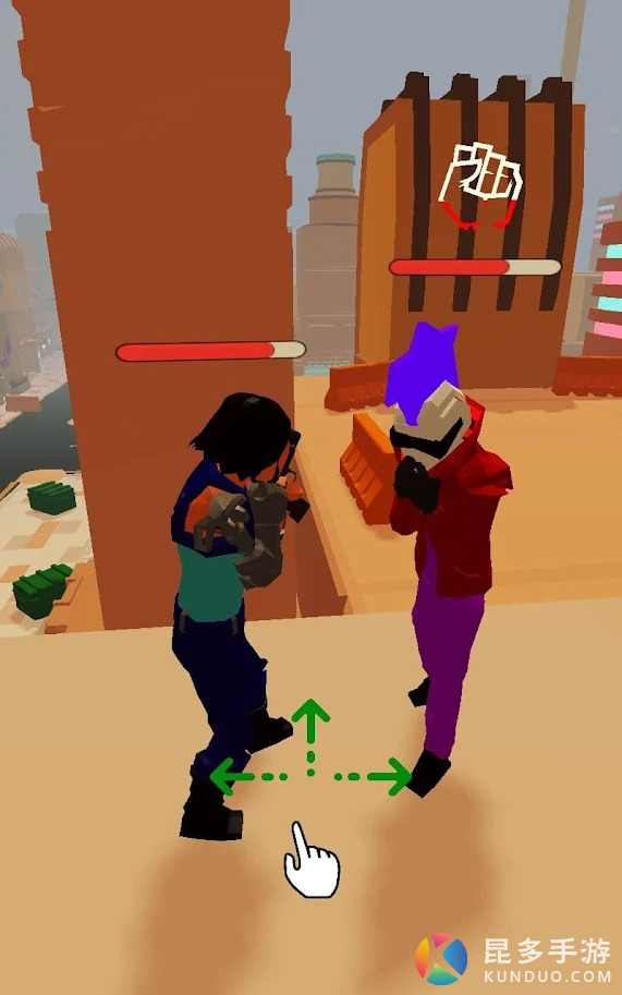 进入游戏后根据提示掌握基本操作模式,上下左右滑动屏幕,可以出拳出腿,和近身敌人搏斗。